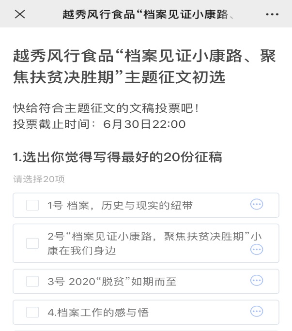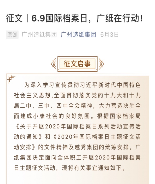 圍繞今年國際檔案日的中國主題“檔案見證小康路、聚焦扶貧決勝期”,越秀風行食品、廣紙集團分別舉辦了主題征文活動,從檔案的視角全方位講述在黨的領(lǐng)導下,集團員工在決勝全面小康、決戰(zhàn)脫貧攻堅過程中的生動實踐、先進典型和感人事跡。活動吸引板塊一線員工踴躍投稿,共收到征文54篇,評選出的優(yōu)秀作品將代表集團參加國家檔案局主題征文活動。